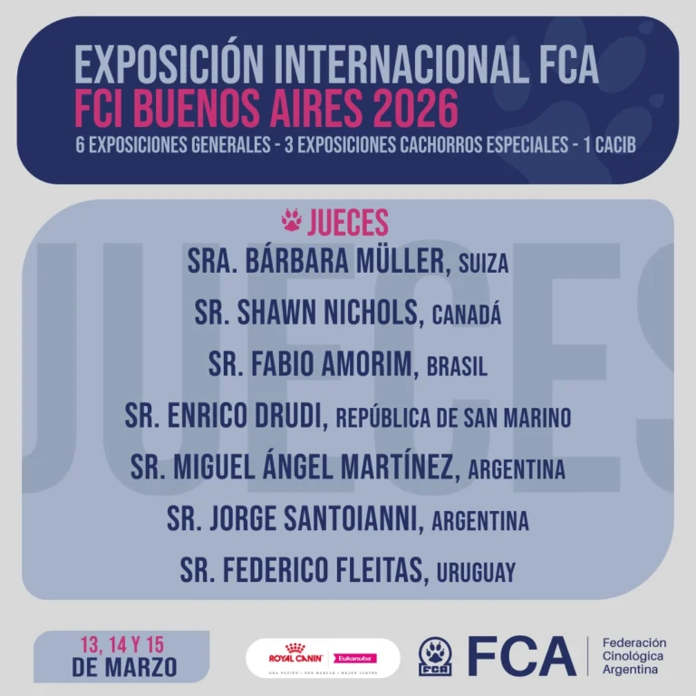 Con su amplia programación, oportunidades de títulos y participación internacional, la Exposición Internacional FCA/FCI Buenos Aires 2026 promete convertirse nuevamente en una verdadera celebración de la cinofilia, reuniendo a profesionales, aficionados y amantes de los perros de raza en un entorno competitivo y social de primer nivel.